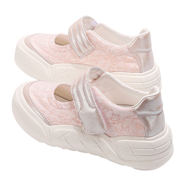 Elevate your style with these charming and contemporary platform shoes. A perfect blend of retro style and modern flair, these shoes feature a delicate, tonal pattern, complemented by a striking metallic hook-and-loop strap for a secure and stylish fit.